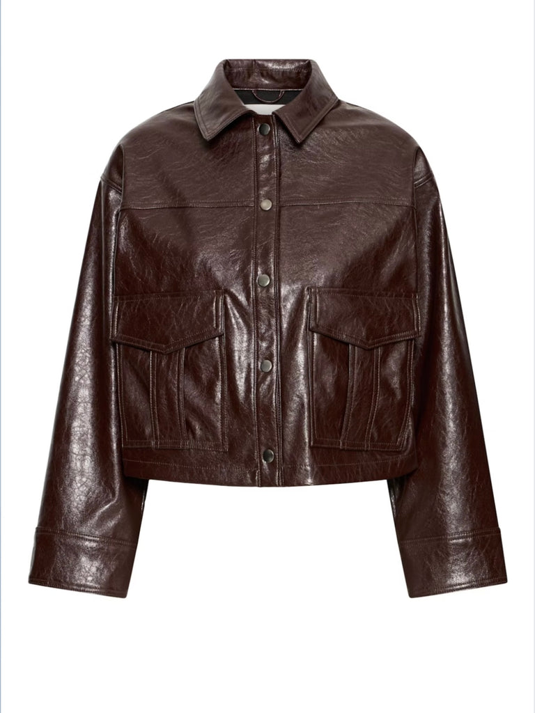 Make a bold statement with our Burgundy Faux Crackled Leather Jacket by B Young - Where vintage edge meets modern sophistication. Crafted from high quality faux leather with a distinctive crackled finish, this jacket offers a rich, worn-in look with boxy silhouette making it a standout piece for any wardrobe.