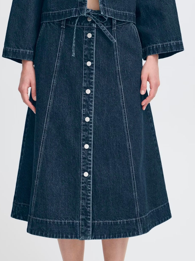 This A-line denim skirt offers a fresh take on a timeless classic. Crafted from sturdy dark-wash denim, it features a flattering high-rise waist with a self-tie belt that adds a touch of definition and feminine charm. The front button-down closure with silver-toned snaps lends a vintage-inspired feel. Falling to a midi length, this skirt pairs effortlessly with everything from tucked-in tees to cosy knits, making it a versatile staple for any season.