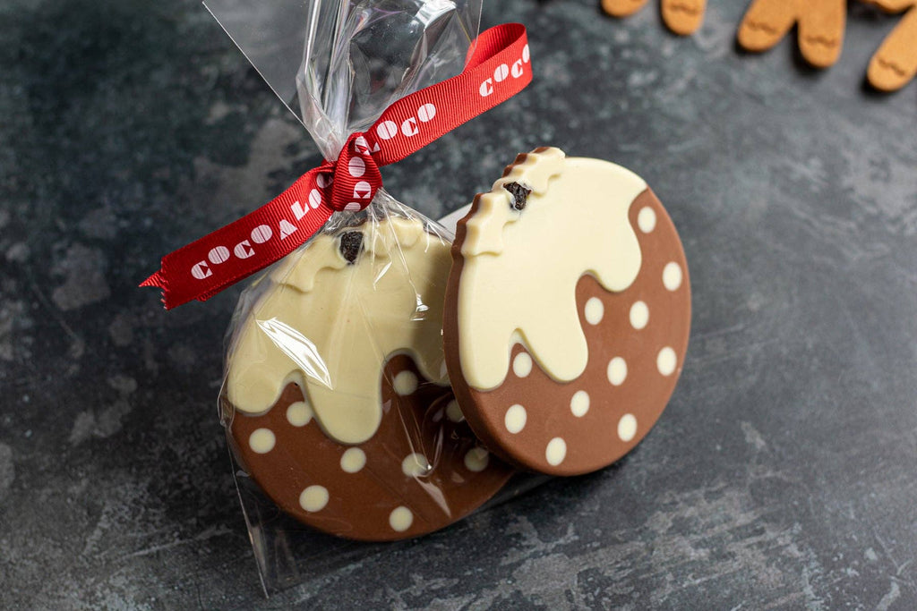 Our silky smooth milk and white chocolate Christmas puddings are scrumptious enough to satisfy the most discerning chocolate lover. You can even hang this on your Christmas Tree using our ribbon hoop, if you can resist eating it! Vegetarian, Palm Oil Free, Fairtrade certified and Organic 6x 70g. Plastic Free Packaging
