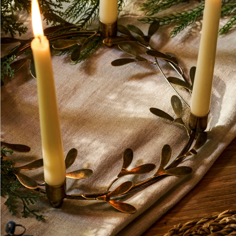 The perfect choice for a Christmas dinner table centrepiece, our Cromwell Mistletoe Christmas Candle Ring takes the form of a charming mistletoe wreath laid flat. Made from steel with a shiny brass finish, it holds four 21mm dinner candles and would be ideal for a traditional red, green and gold festive colour scheme. It would also work well displayed in a deep windowsill to delight everyone indoors and out.