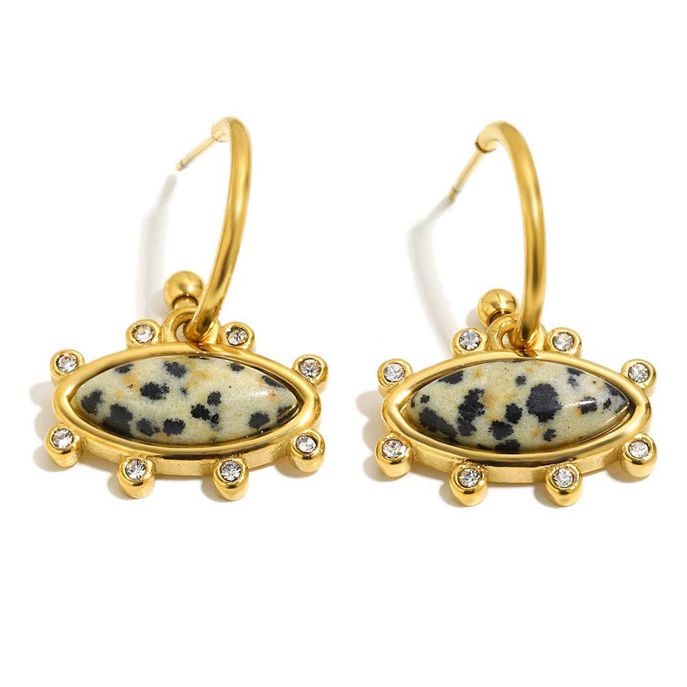 The Aluna Earrings bring together natural beauty and refined sparkle, featuring a horizontal oval design with striking Dalmatian jasper at the centre, framed by shimmering cubic zirconia for an elevated finish.