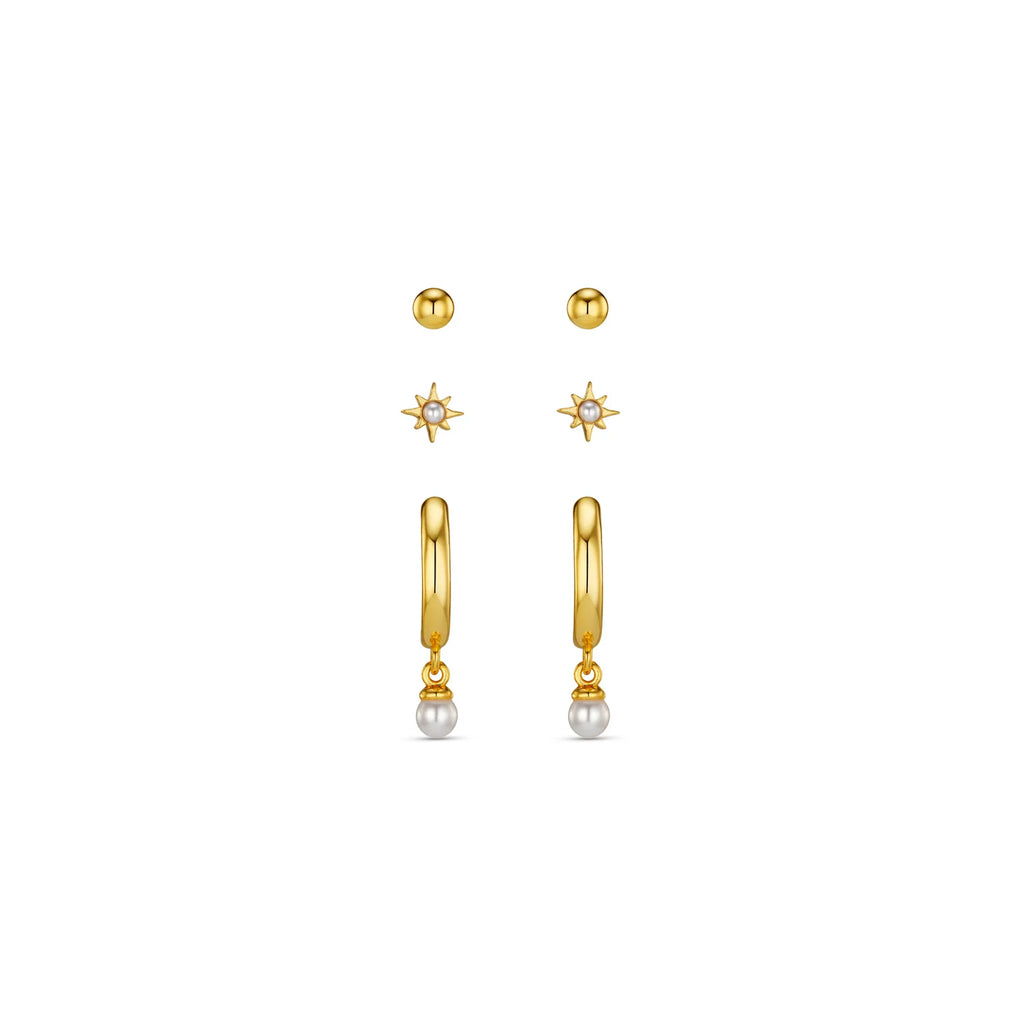Featuring classic ball studs, a starburst shaped stud earring with centre pearl and our bestselling micro hoop earrings with a gorgeous drop pearl charm.