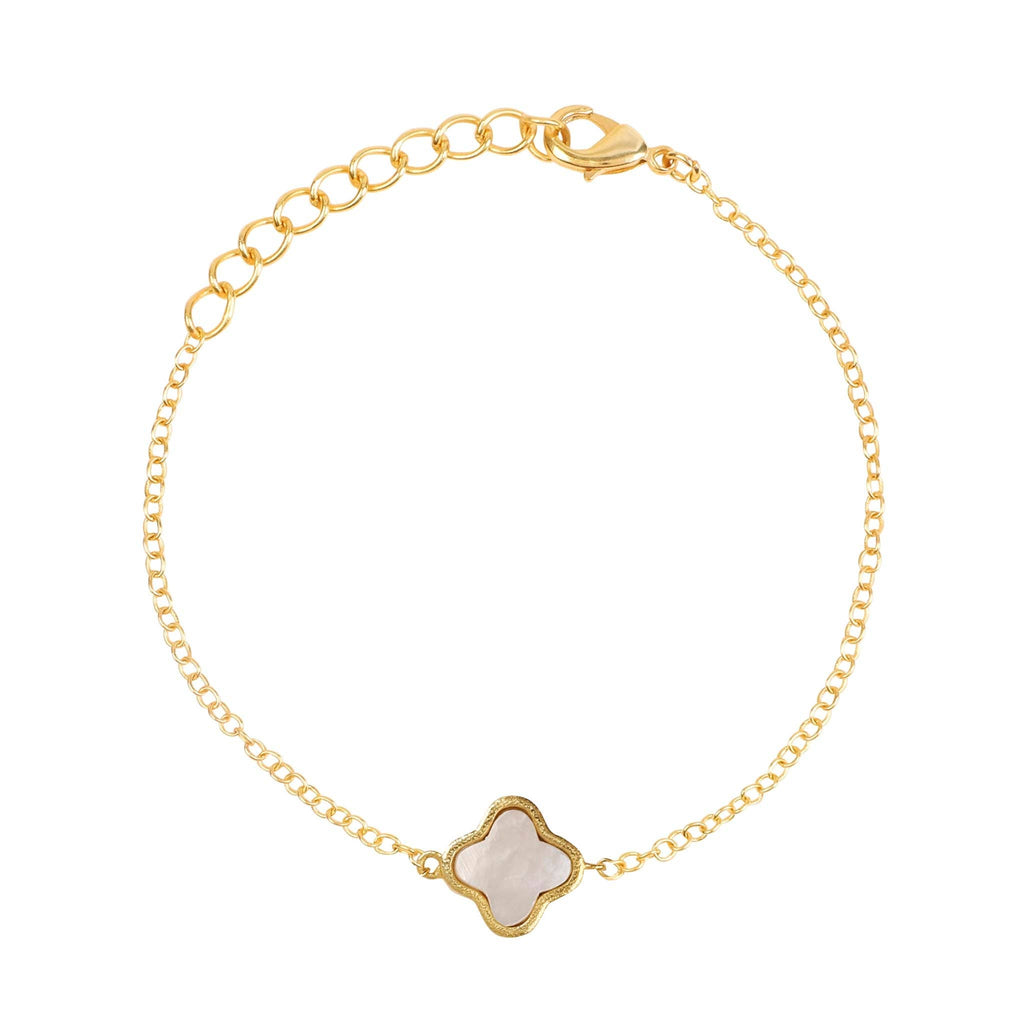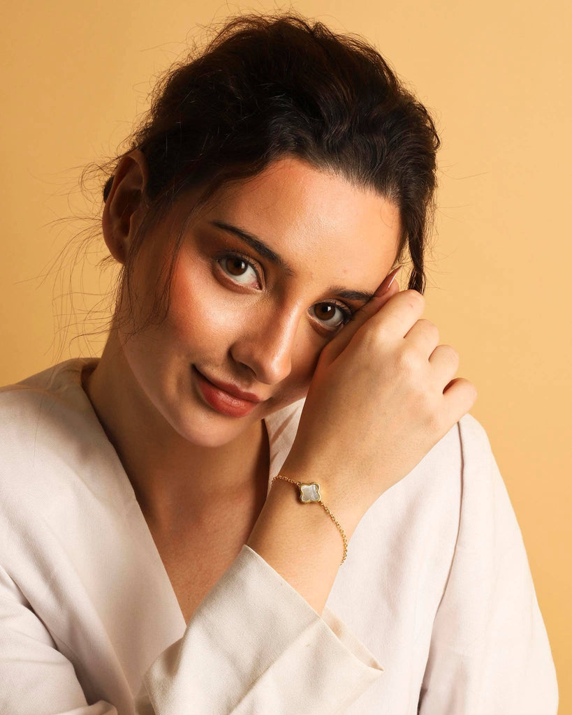 Clover Mother of Pearl Bracelet from Lila Rasa—a symbol of luck, charm, and natural elegance. The four leaves of the clover hold profound significance each leaf represents hope, faith, love, and luck—four elements that weave together to create a harmonious and abundant life. The Mother of Pearl is semi-precious gemstone that helps us dive deep into ourselves. It encourages introspection and reflection, the steppingstones of discovering who we truly are. With this little piece of mother nature, you can get in touch with your authentic self. Significance : Chakra: Third Eye Element: Air Birthstone: June Wear this Clover Mother of Pearl jewellery as a captivating accessory, effortlessly adding elegance and sophistication to any outfit. Whether it's a special occasion or a daily reminder of your inner radiance, this bracelet exudes timeless beauty and becomes a cherished piece.