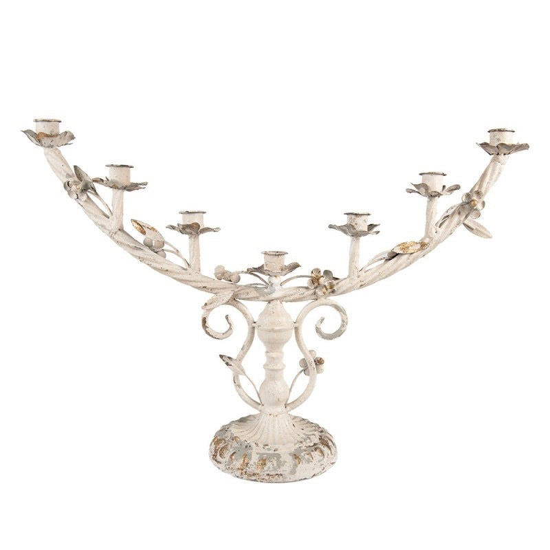 Designed to hold seven taper candles, its gracefully curved arms and decorative base make it the perfect centre piece for weddings, special events, or vintage-inspired home décor. The weathered finish adds character, giving it a romantic, French country feel that complements both classic and shabby chic interiors.