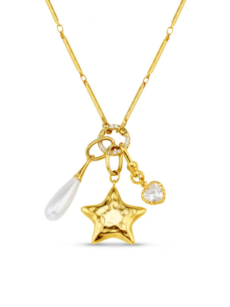 The Mixed Charm Long Cluster Necklace pairs an elongated bar-link chain with a distinctive trio of charms. A bold molten-textured star, a delicate teardrop pearl, and a sparkling heart-shaped crystal. Each charm is connected to a crystal-accented ring, forming a striking clustered arrangement that catches the light beautifully.