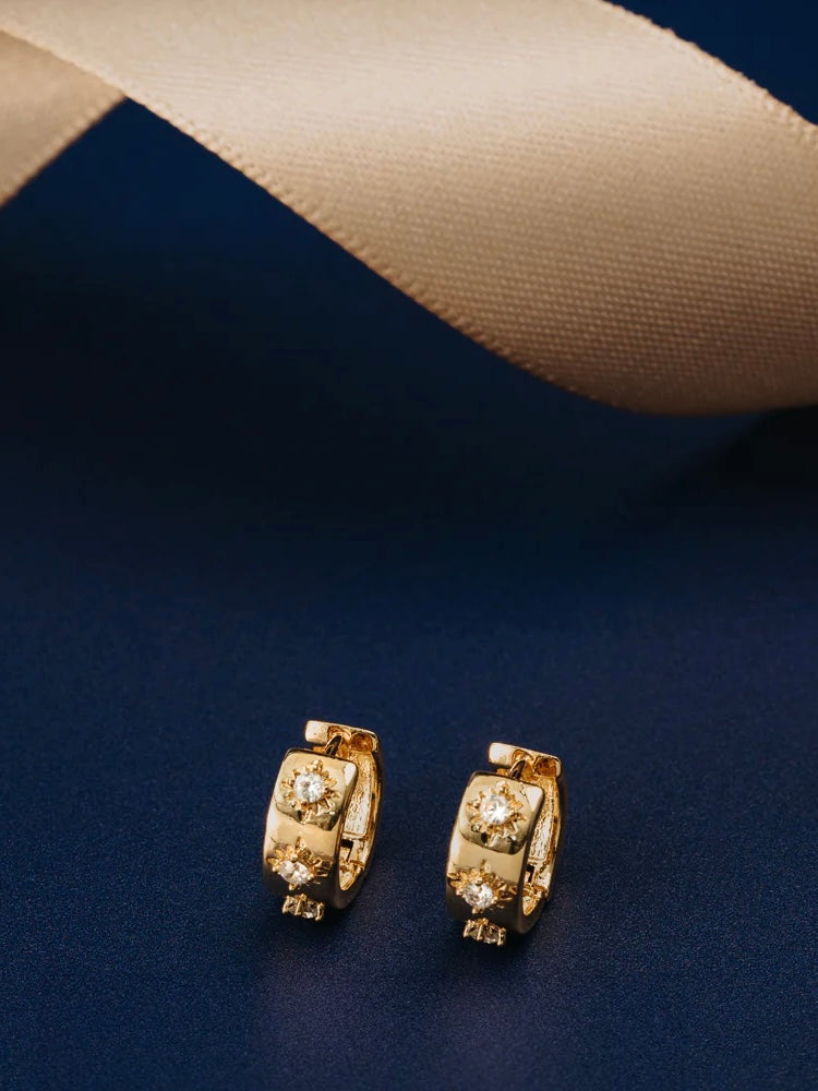 The Starburst Embellished Huggie Hoop Earrings. A subtle nod to statement styling, chunky gold hoop earrings adorned with radiant starburst engravings. Their bold yet wearable design strikes the perfect balance between everyday edge and cosmic elegance.