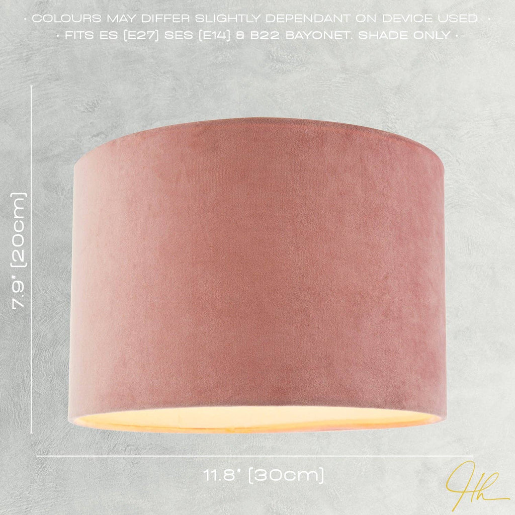 Contemporary and elegant circular drum shaped lamp shade suitable for any room in he house or business. Made of high-quality soft velvet blush pink fabric with sleek matching light pink inner cotton lining giving this shade a very luxurious feel and look. The product dimensions are as follows: Height - 20cm, Top diameter - 30cm, Bottom diameter - 30cm. Maximum wattage allowed is 11w. Features a reversible gimbal allowing usage for both table lamps and pendant ceiling roses. Complete with shade reducer ring allowing for most lamp bases - B22/BC, E14/SES and E27/ES. Light bulb not included.