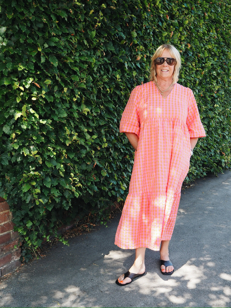 The LINA Gingham Midi Dress is designed for effortless summer styling. Cut from 100% cotton, it features a pink and orange gingham print that feels fresh and versatile. The relaxed V-neck shape, 3/4 length sleeves with elasticated cuffs, and tiered hem detail create a flattering and comfortable silhouette. Plus, it comes with side pockets, adding both practicality and ease to this everyday piece. A perfect choice for warm-weather dressing, this midi dress can be styled with sandals for a casual daytime look or dressed up with accessories for an elevated finish.