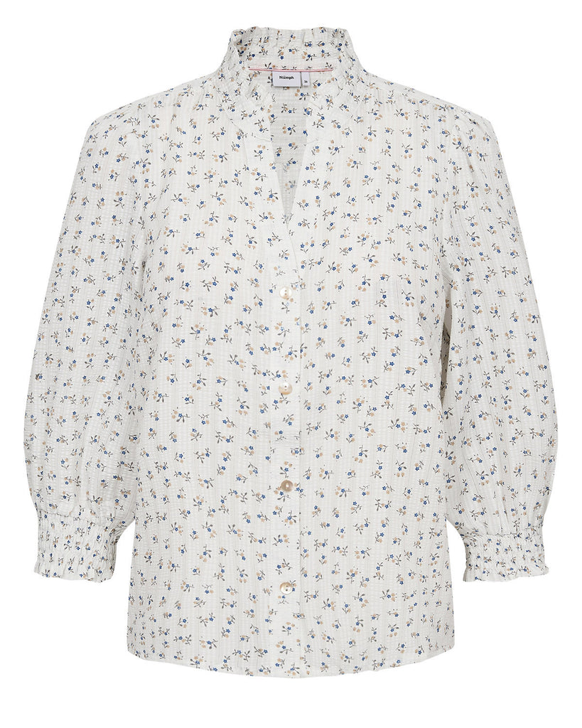Featuring a subtle floral print in soft gray-blue tones and a relaxed, feminine fit, this versatile shirt is perfect for layering or wearing on its own for a chic, effortless look.
