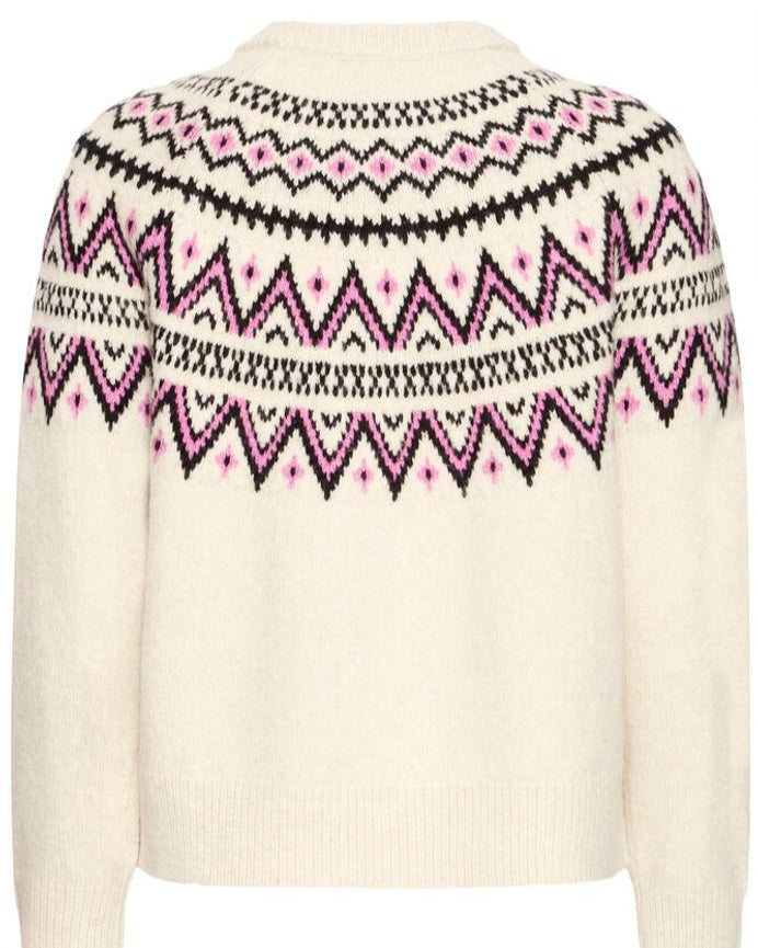 Add a cozy and stylish touch to your winter wardrobe with this classic knit jumper. Featuring a traditional geometric pattern in shades of black, pink, and lilac across the yoke and sleeves, this soft cream jumper is crafted from a warm and comfortable knit blend. With a relaxed fit, crew neckline, and ribbed trims, it's perfect for layering over jeans or pairing with a skirt for a chic cold-weather look.
