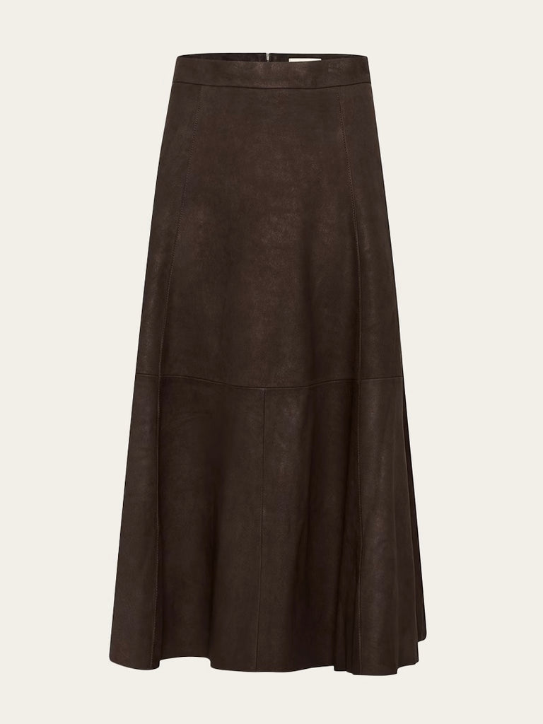 Refined and timeless, this high-waisted A-line midi skirt is crafted from a soft leather that drapes beautifully with every step. Designed to flatter with its fitted waist and flowing silhouette, it offers effortless elegance for both everyday wear and more polished occasions.
