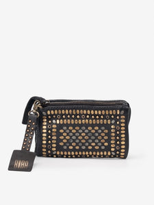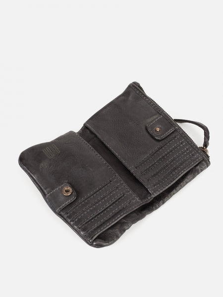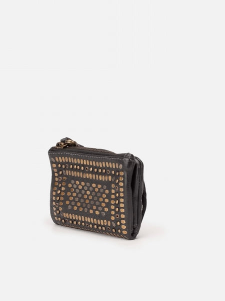 Washed and vegetable-tanned calf leather wallet. Metal studs on the front. Compartments for cards, bills, and coins.